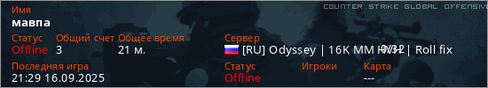 Играет на Counter Strike Global Offensive сервере. Страна: РоссияПервый раз замечен 19:33 09.09.2025