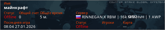 Играет на Counter Strike Global Offensive сервере. Страна: РоссияПервый раз замечен 08:02 27.01.2026
