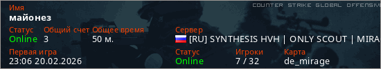 Играет на Counter Strike Global Offensive сервере. Страна: РоссияПервый раз замечен 23:06 20.02.2026