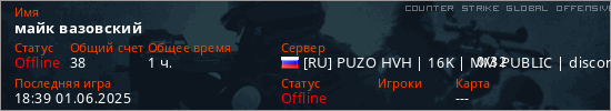 Играет на Counter Strike Global Offensive сервере. Страна: РоссияПервый раз замечен 12:04 07.05.2025