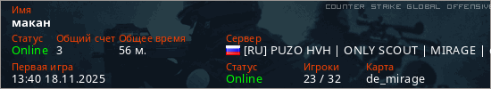 Играет на Counter Strike Global Offensive сервере. Страна: РоссияПервый раз замечен 13:40 18.11.2025