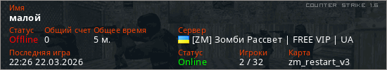 Играет на Counter Strike 1.6 сервере. Страна: УкраинаПервый раз замечен 22:11 22.03.2026