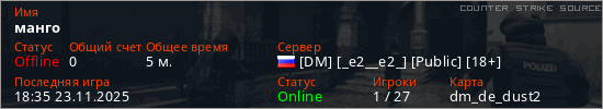 Играет на Counter Strike Source сервере. Страна: РоссияПервый раз замечен 18:33 23.11.2025