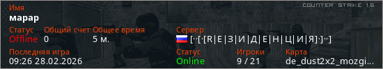 Играет на Counter Strike 1.6 сервере. Страна: РоссияПервый раз замечен 09:16 28.02.2026