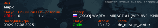 Играет на Counter Strike Global Offensive сервере. Страна: РоссияПервый раз замечен 22:56 28.03.2025