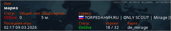 Играет на Counter Strike Global Offensive сервере. Страна: РоссияПервый раз замечен 02:00 09.03.2026
