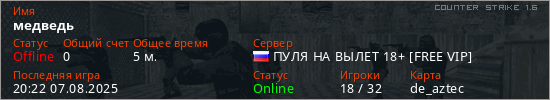 Играет на Counter Strike 1.6 сервере. Страна: РоссияПервый раз замечен 20:20 07.08.2025