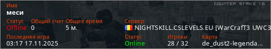 Последний раз был в сети 03:17 17.11.2025 Игрок с таким ником замечен на 5 серверах