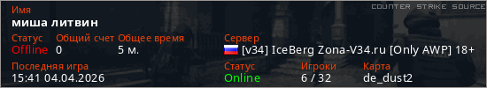 Играет на Counter Strike Source сервере. Страна: РоссияПервый раз замечен 15:34 04.04.2026