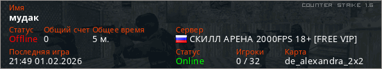 Играет на Counter Strike 1.6 сервере. Страна: РоссияПервый раз замечен 21:21 01.02.2026