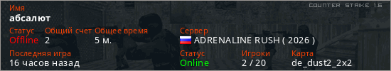 Играет на Counter Strike 1.6 сервере. Страна: РоссияПервый раз замечен 20:55 08.02.2026