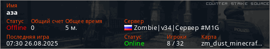 Играет на Counter Strike Source сервере. Страна: РоссияПервый раз замечен 07:26 26.08.2025