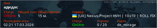 Играет на Counter Strike Global Offensive сервере. Страна: УкраинаПервый раз замечен 02:12 11.03.2026