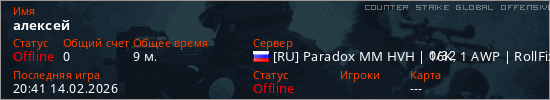 Играет на Counter Strike Global Offensive сервере. Страна: РоссияПервый раз замечен 20:06 14.02.2026