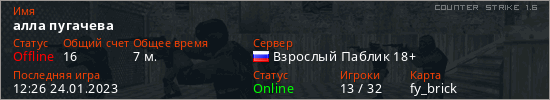 Играет на Counter Strike 1.6 сервере. Страна: РоссияПервый раз замечен 12:22 24.01.2023