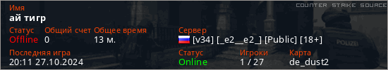 Играет на Counter Strike Source сервере. Страна: РоссияПервый раз замечен 19:44 22.10.2024