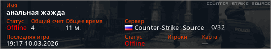 Играет на Counter Strike Source сервере. Страна: РоссияПервый раз замечен 11:00 10.03.2026