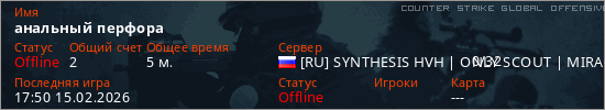 Играет на Counter Strike Global Offensive сервере. Страна: РоссияПервый раз замечен 17:04 15.02.2026