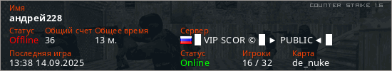 Играет на Counter Strike 1.6 сервере. Страна: РоссияПервый раз замечен 21:55 13.09.2025