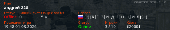 Играет на Counter Strike 1.6 сервере. Страна: РоссияПервый раз замечен 19:39 01.03.2026