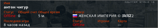 Играет на Counter Strike 1.6 сервере. Страна: РоссияПервый раз замечен 22:23 24.04.2026