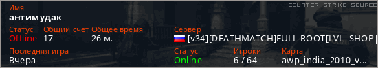 Играет на Counter Strike Source сервере. Страна: РоссияПервый раз замечен 13:00 29.01.2025