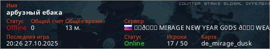 Играет на Counter Strike Global Offensive сервере. Страна: РоссияПервый раз замечен 15:31 29.06.2025