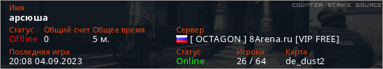 Играет на Counter Strike Source сервере. Страна: РоссияПервый раз замечен 19:23 04.09.2023