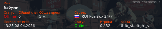 Играет на Team Fortress 2 сервере. Страна: РоссияПервый раз замечен 13:15 08.04.2026