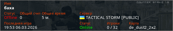 Играет на Counter Strike 1.6 сервере. Страна: УкраинаПервый раз замечен 19:19 06.03.2026