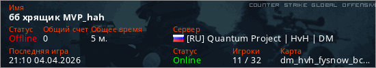 Играет на Counter Strike Global Offensive сервере. Страна: РоссияПервый раз замечен 21:08 04.04.2026