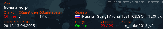 Играет на Counter Strike Global Offensive сервере. Страна: РоссияПервый раз замечен 19:19 06.04.2025