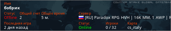 Играет на Counter Strike Global Offensive сервере. Страна: РоссияПервый раз замечен 21:14 24.12.2025