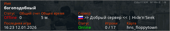 Играет на Counter Strike 1.6 сервере. Страна: РоссияПервый раз замечен 15:56 12.01.2026