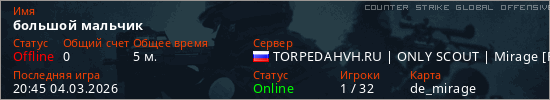 Играет на Counter Strike Global Offensive сервере. Страна: РоссияПервый раз замечен 20:43 04.03.2026