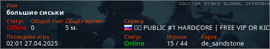 Играет на Counter Strike Global Offensive сервере. Страна: РоссияПервый раз замечен 00:25 27.04.2025