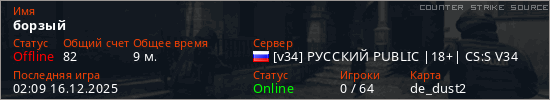 Играет на Counter Strike Source сервере. Страна: РоссияПервый раз замечен 19:40 13.12.2025