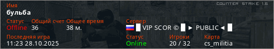 Играет на Counter Strike 1.6 сервере. Страна: РоссияПервый раз замечен 13:55 15.10.2025