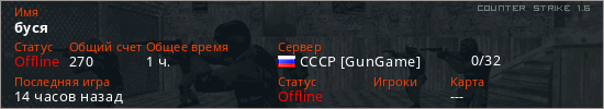 Играет на Counter Strike 1.6 сервере. Страна: РоссияПервый раз замечен 14:44 10.04.2026