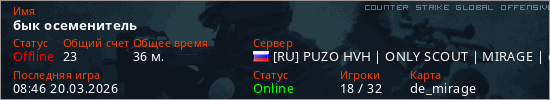 Играет на Counter Strike Global Offensive сервере. Страна: РоссияПервый раз замечен 10:37 16.03.2026