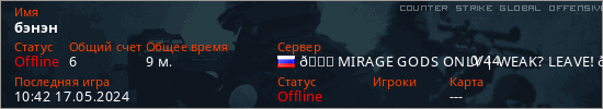 Играет на Counter Strike Global Offensive сервере. Страна: РоссияПервый раз замечен 05:56 26.04.2024