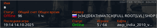 Играет на Counter Strike Source сервере. Страна: РоссияПервый раз замечен 17:02 16.07.2025