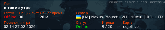 Играет на Counter Strike Global Offensive сервере. Страна: УкраинаПервый раз замечен 23:17 26.02.2026