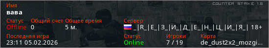 Играет на Counter Strike 1.6 сервере. Страна: РоссияПервый раз замечен 23:00 05.02.2026