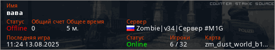 Играет на Counter Strike Source сервере. Страна: РоссияПервый раз замечен 11:06 13.08.2025