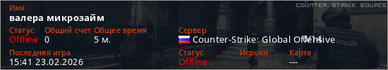 Играет на Counter Strike Source сервере. Страна: РоссияПервый раз замечен 15:24 23.02.2026