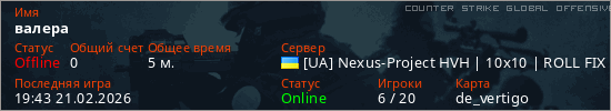 Играет на Counter Strike Global Offensive сервере. Страна: УкраинаПервый раз замечен 19:39 21.02.2026