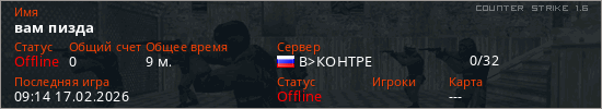 Играет на Counter Strike 1.6 сервере. Страна: РоссияПервый раз замечен 22:16 16.02.2026