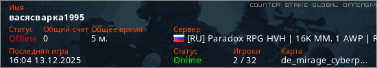 Играет на Counter Strike Global Offensive сервере. Страна: РоссияПервый раз замечен 15:56 13.12.2025