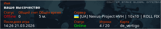 Играет на Counter Strike Global Offensive сервере. Страна: УкраинаПервый раз замечен 14:19 21.03.2026